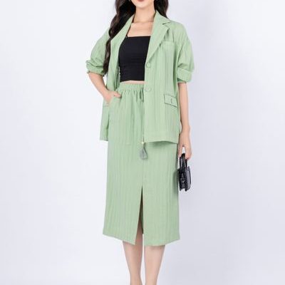BJD13053 Chân váy công sở vải thô đũi dáng suông có lót vải habutai cạp chun phối dây rút tua rua trang trí xẻ thân trước tạo kiểu