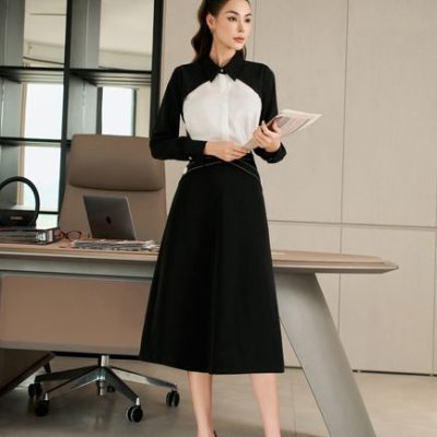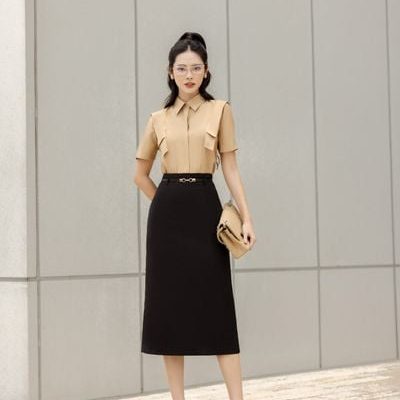 BJD12994 Chân váy công sở vải tuytsi dáng A có lót vải habutai cạp kiểu phối đai trang trí khóa thân sau