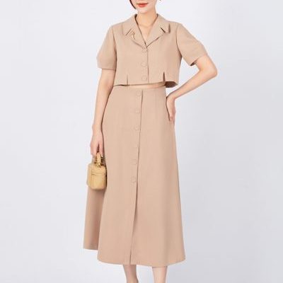 BJD12995 Chân váy công sở vải thô dáng A có lót vải habutai thân phối nắp túi khác màu đính ngọc trai tạo kiểu khóa thân sau