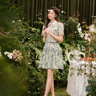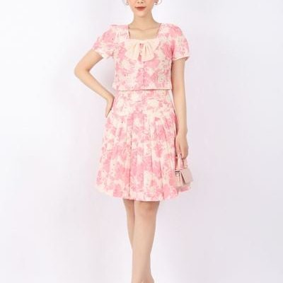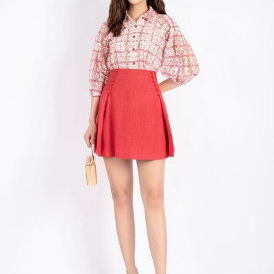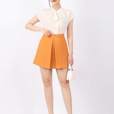 BJN33112 Chân váy ngắn vải tơ hai lớp lót habutai gấu váy xếp ly phối ren hoa trang trí khoá thân sau