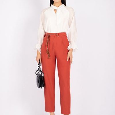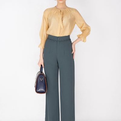 FQD1939 Quần công sở vải tuytsi dáng suông ống rộng cạp cao dây trang trí